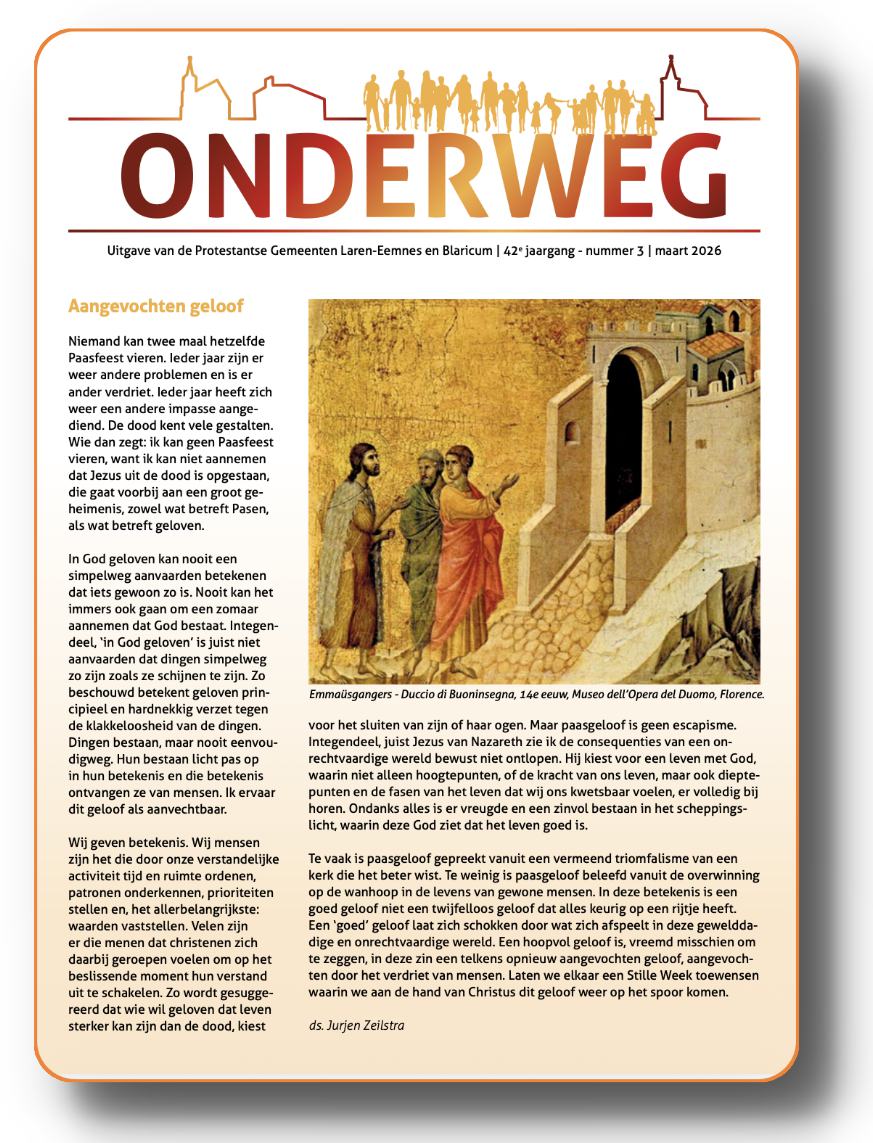 De website-redactie "ontleent" informatie uit kerkblad "Onderweg" en plaatst artikelen hieruit op de Blaricumse website. Voor de online versie klik hier. Oudere nummers van "Onderweg" zijn op aanvraag digitaal beschikbaar. Mail uw aanvraag dan naar de